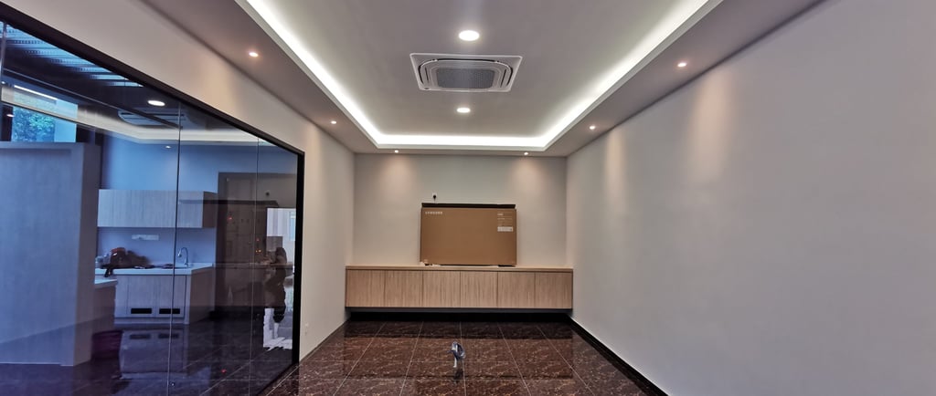 The renovation of TTF Group, specialists in shelving systems, combines elegance and functionality to reflect the company’s premium offerings. The office features grand marble-look tiles, creating a sophisticated and welcoming atmosphere for both employees and customers. The showroom showcases TTF’s shelving solutions, with a sleek island table designed to feature detailed product profiles and facilitate customer interactions. The space also includes a boardroom and meeting room, designed for business discussions and future partnerships, ensuring a professional setting for strategic meetings. This design balances high-end aesthetics with practical, client-focused spaces.